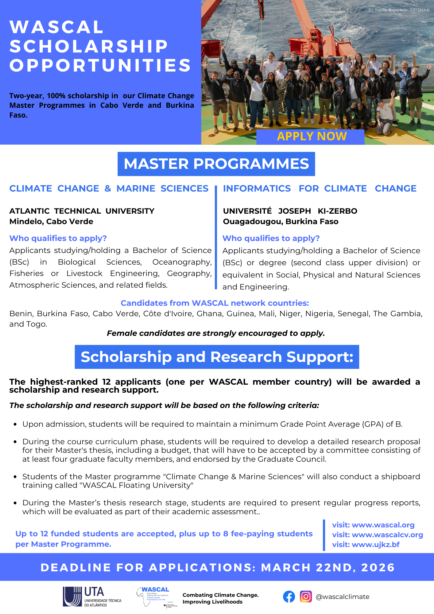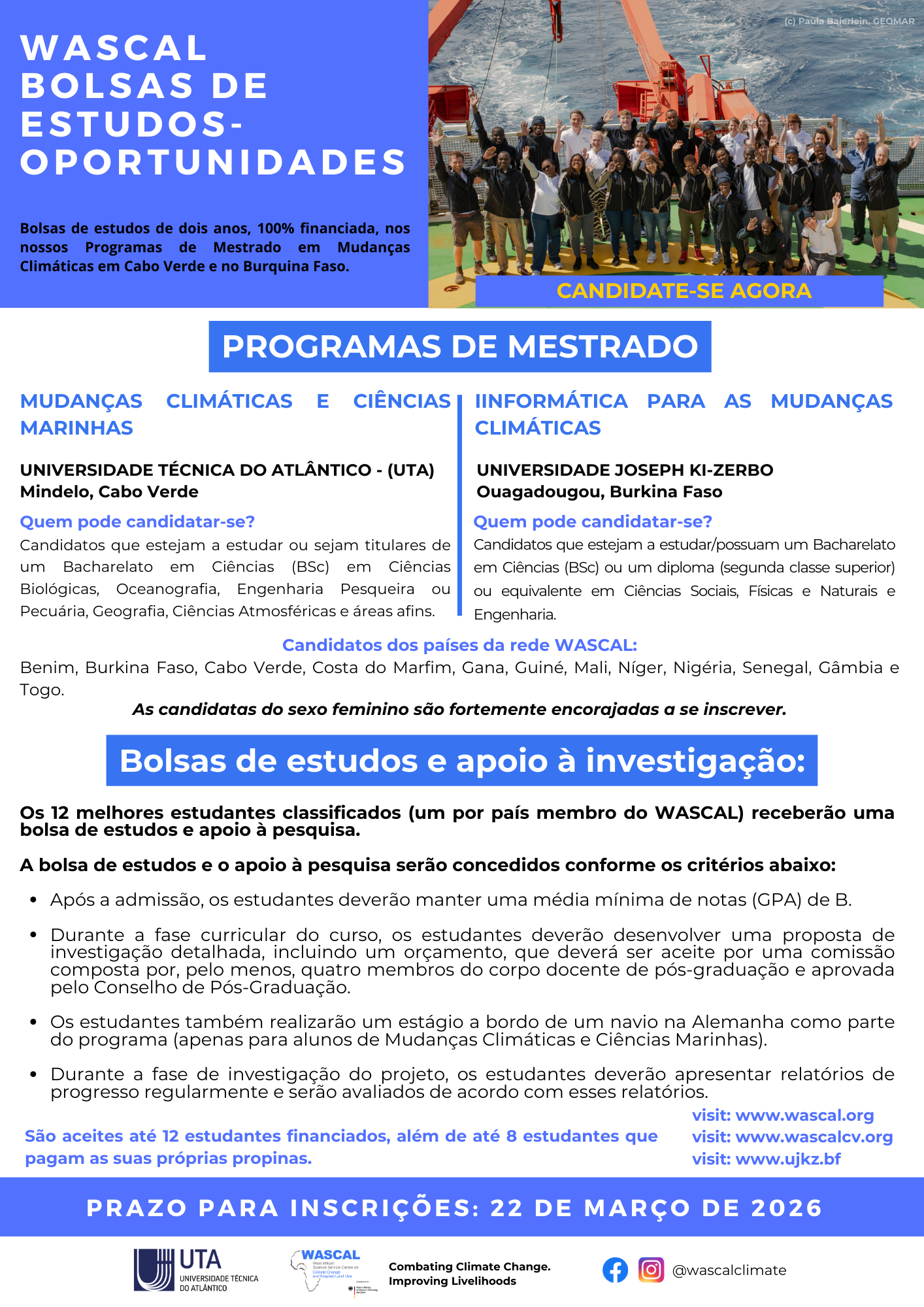 Paralelamente, a WASCAL Cabo Verde divulga também a abertura das candidaturas para o Programa de Mestrado em Investigação em Informática para as Alterações Climáticas que proporciona formação avançada em informática e ciência de dados aplicadas aos desafios climáticos, preparando os estudantes para uma abordagem inovadora e tecnológica na investigação científica. Este mestrado é implementado pela Université Joseph Ki-Zerbo em Burkina Faso.