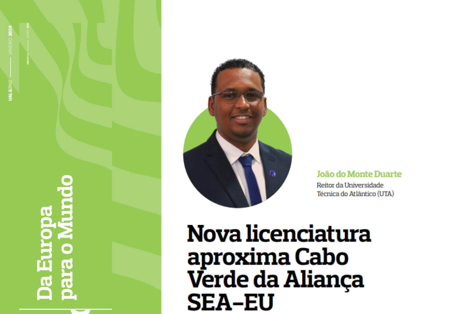 A mais recente edição da revista da Universidade do Algarve, UALGzine n.º 18, é inteiramente dedicada à Aliança SEA-EU — Universidade Europeia dos Mares — e destaca iniciativas de cooperação académica, inovação azul, sustentabilidade e formação avançada nas regiões costeiras. Entre os conteúdos em evidência encontra-se um artigo com contributos do reitor da Universidade Técnica do Atlântico sobre a criação da licenciatura em Gestão e Fomento do Turismo na Ilha do Sal.